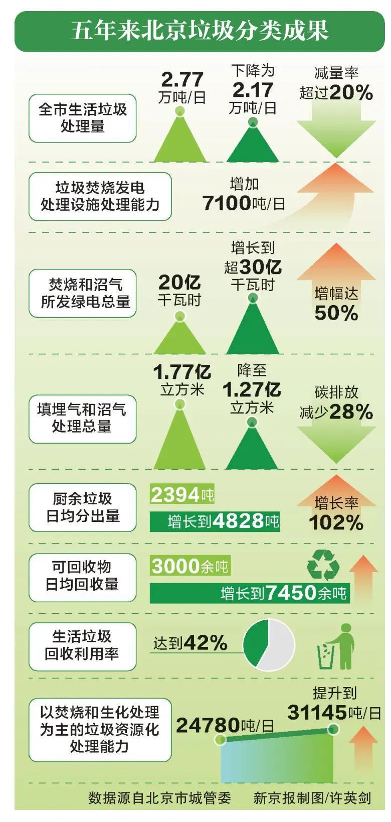 记者从北京市城管委了解到,新版《北京市生活垃圾管理条例》实施五年来,全市生活垃圾日处理量下降超20%,可回收物日均回收量从3000吨升至7450吨。目前,全市已完成5.75万个垃圾桶站改造,构建直达居民的回收模式,让垃圾分类从“关键小事”成为城市文明新标杆。