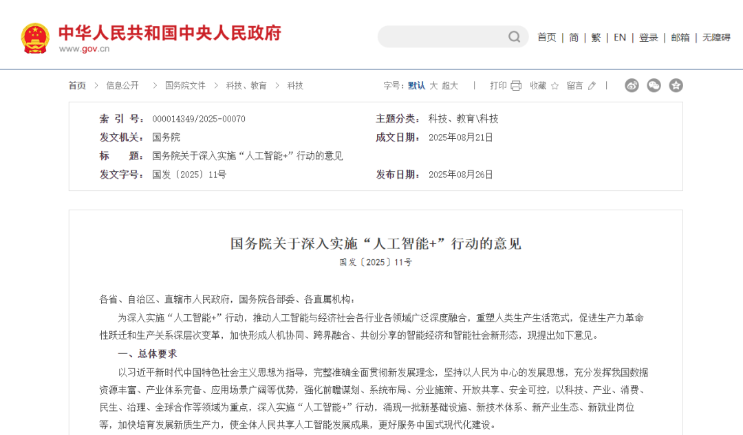 近日,国务院正式印发《关于深入实施“人工智能+”行动的意见》(国发〔2025〕11号),这份重磅文件为人工智能与经济社会各领域深度融合提供了全面指导。